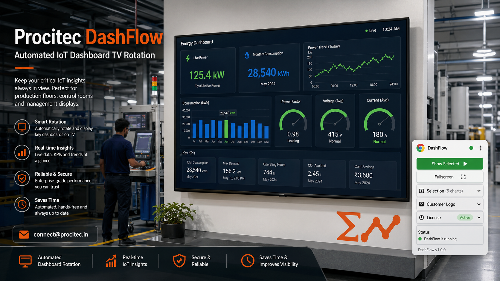 Procitec DashFlow is positioned for industrial teams that want a cleaner way to run TV dashboards, rotating KPIs, and branded monitoring screens across operational spaces.